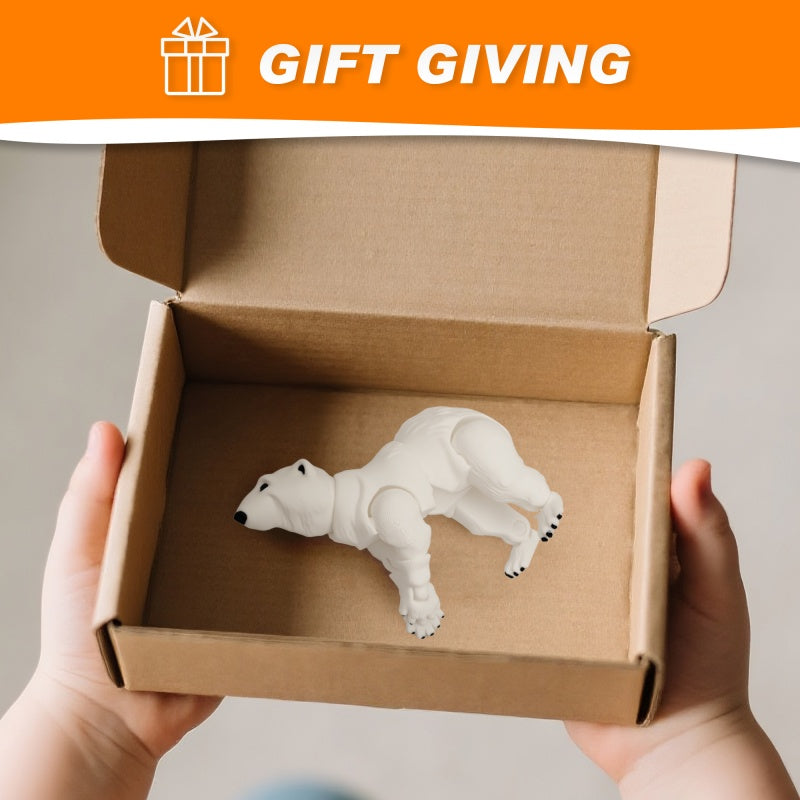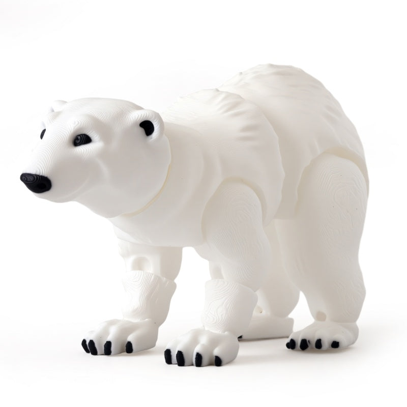 This 3D printed articulated polar bear measures 5 inches long and 3 inches tall, designed with flexible joints and a movable head for natural, poseable expression. Whether standing tall or lying down, this polar bear brings the arctic spirit to any shelf, desk, or display. Its clean white finish and smooth form make it a charming decorative piece and a satisfying object to pose and handle. A unique blend of playfulness and minimalist design.